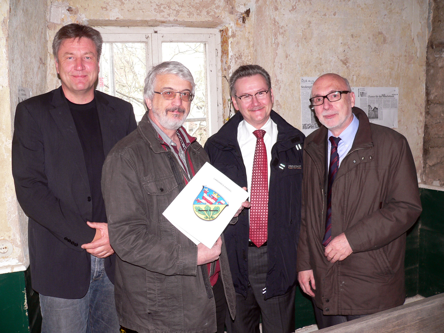 Auf dem Foto sieht man das Mönchshaus in Espenau, Bürgermeister Michael Wielert, Vereinsvorsitzender Hans-Dieter Baller, Landrat Uwe Schmidt und Landeskonservator Prof. Dr. Gerd Weiß.