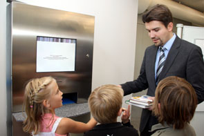 An zwei Innenstationen werden die Bücher über einen Schacht abgegeben, eine Quittung erhält der Kunde auf Wunsch. Die Rückgabestationen befinden sich direkt im Foyer.