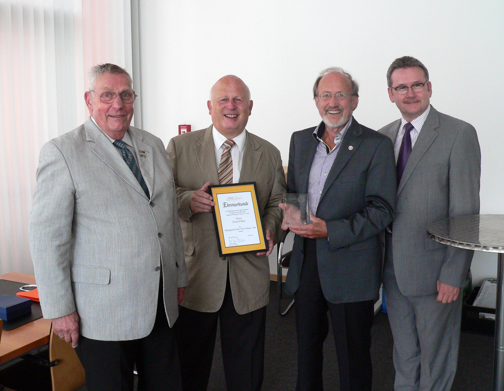 Auf dem Bild sieht man von links nach rechts Oberst a.D. Jürgen Damm, Oberst a.D. Dirk Engel, Erwin Pöttner und Landrat Uwe Schmidt mit dem Karl-Heinz-Jörgens-Glas.