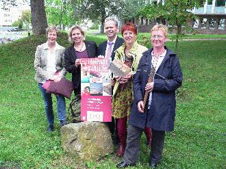 Auf dem Foto sieht man von links nach rechts Angelika Webering (Eigenbetrieb Jugend-Freizeiteinrichtungen) mit ihrem Heimat-Ding Sofakissen, Vizelandrätin Susanne Selbert, Eigenbetriebsleiter Uwe Pietsch, Dorothea Fellinger (LandMuseum Wülmersen) mit ihrem Heimat-Ding Buchenscheit und Dr. Susanne Kost (Universität Kassel und Buchautorin für die Heimat-Dinge) mit ihrem Heimat-Ding Garderobenhaken. Das Foto gibt es in Quer- und Hochformat.