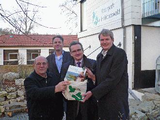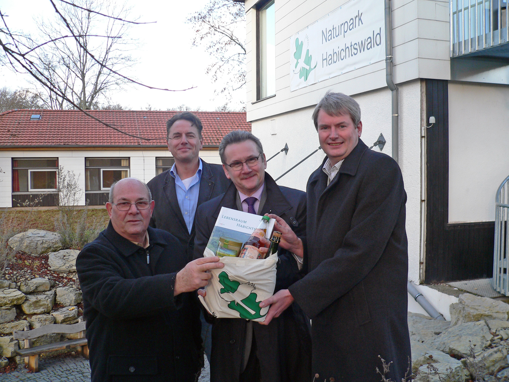 Auf dem Foto sieht man von links nach rechts Herbert Kimm (Kreisbeigeordneter Schwalm-Eder-Kreis), Naturpark-Geschäftsführer Jürgen Depenbrock, Landrat Uwe Schmidt und Peter Nissen (Amt für den ländlichen Raum), die einen Beutel mit Produkten aus dem Naturpark präsentieren.
