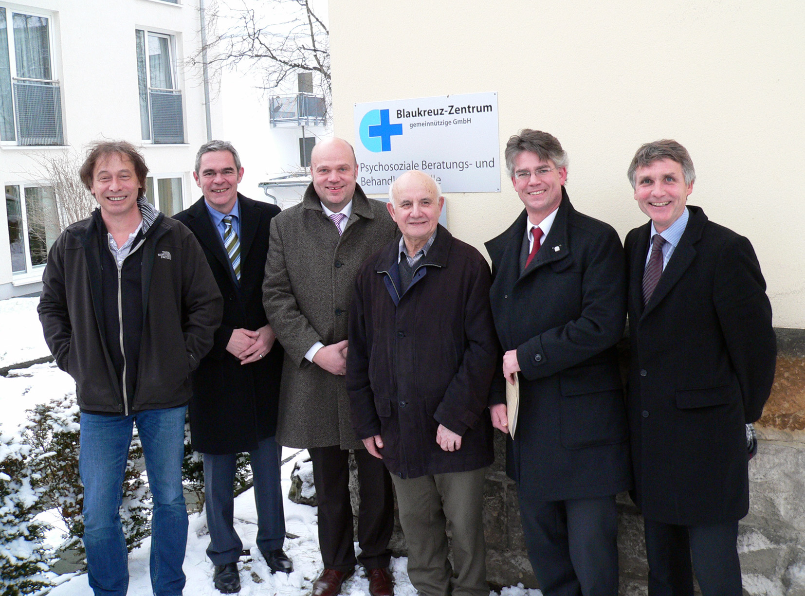 Auf dem Foto sieht man von links nach rechts Bernd Weingarten (Leiter des Blaukreuz-Zentrums), Helmut Frömmel (Leitender Arzt beim Blaukreuz-Zentrum), Tobias Jäger (Geschäftsführer Blaukreuz-Zentrum), Rolf Schleicher (Blaues Kreuz Kassel e.V.), Jörg Roßberg (Fachbereich Soziales Landkreis Kassel) und Pfarrer Joachim Bertelmann (Vorstandsvorsitzener der Baunataler Diakonie Kassel).