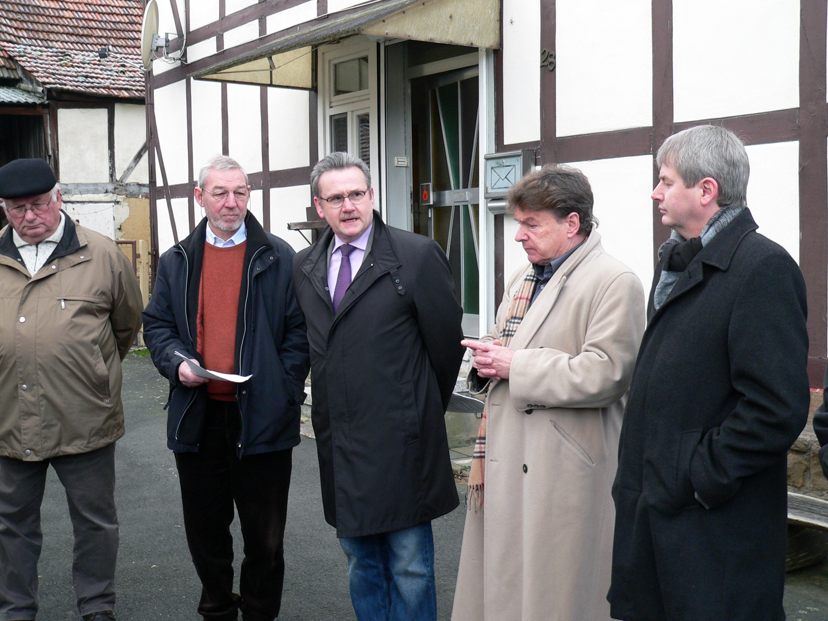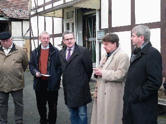 Auf dem Foto unterhalten sich Klaus Wellner (Heimatstube Gottsbüren), Christian Primus (Amt für den ländlichen Raum), Landrat Uwe Schmidt, Bürgermeister Bernhard Klug und Peter Nissen (Amt für den ländlichen Raum).