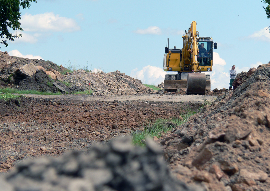 Auf dem Foto sieht man den bereits erfolgten Abtrag der bisherigen Fahrbahndecke und den Bagger der beauftragten Firma gegen 17.00 Uhr am Freitag Nachmittag bei der Arbeit.