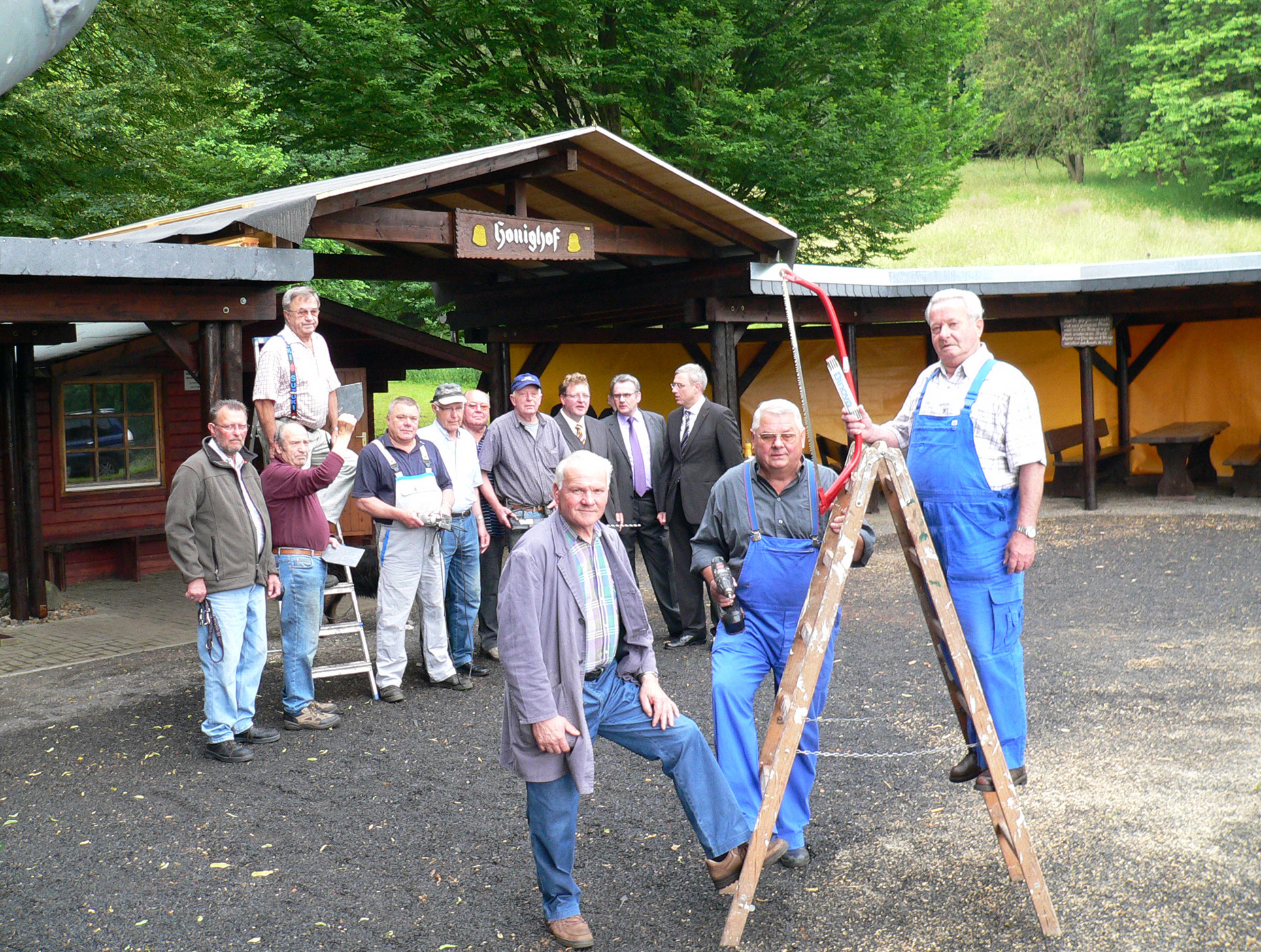 Auf dem Foto sieht man die Aktiven der Wickenröder Vereinsgemeinschaft sowie Bürgermeister Thilo Küthe, Landrat Uwe Schmidt und Dr. Ralf Beinhauer im Hintergrund vor der sanierten Anlage im Regentest.