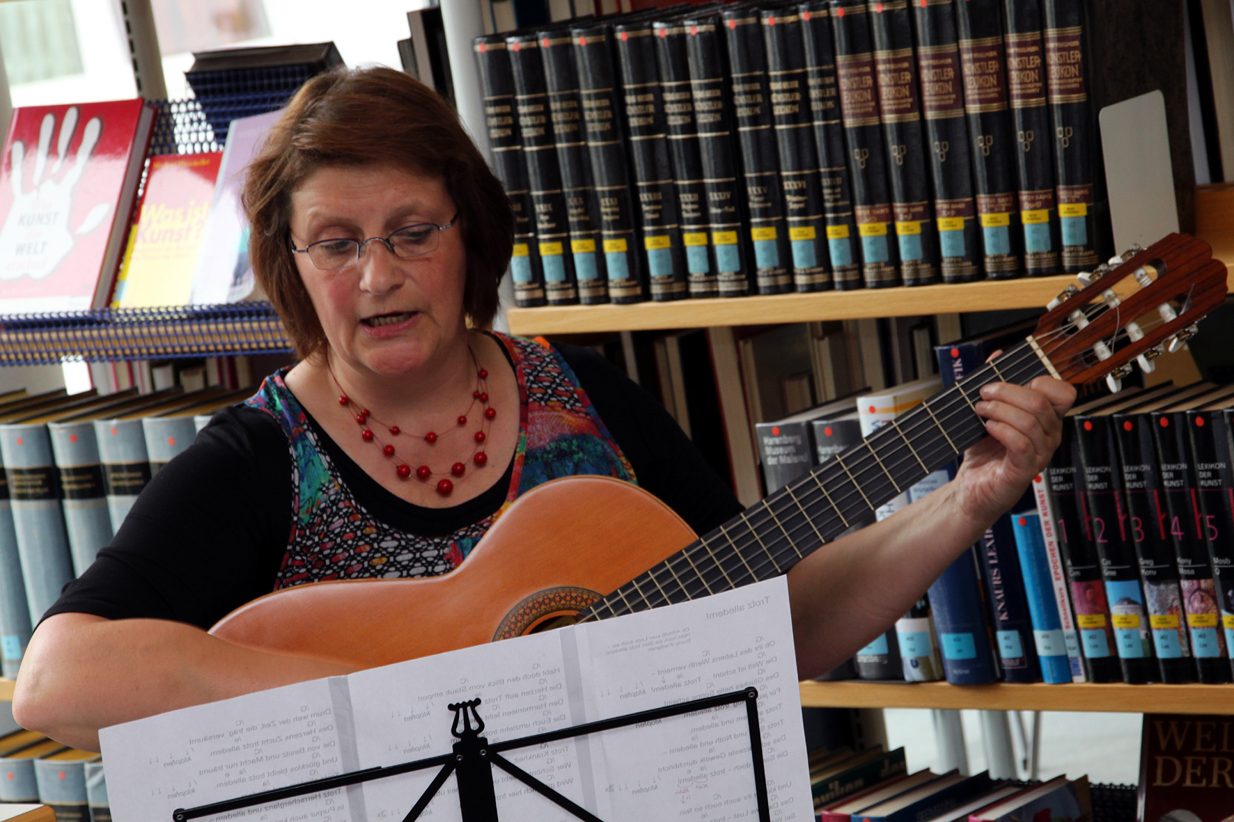Barbara Weiner an der Gitarre präsentiert das Hannes Wader-Lied, dass allen Beteiligten Mut gemacht hat.