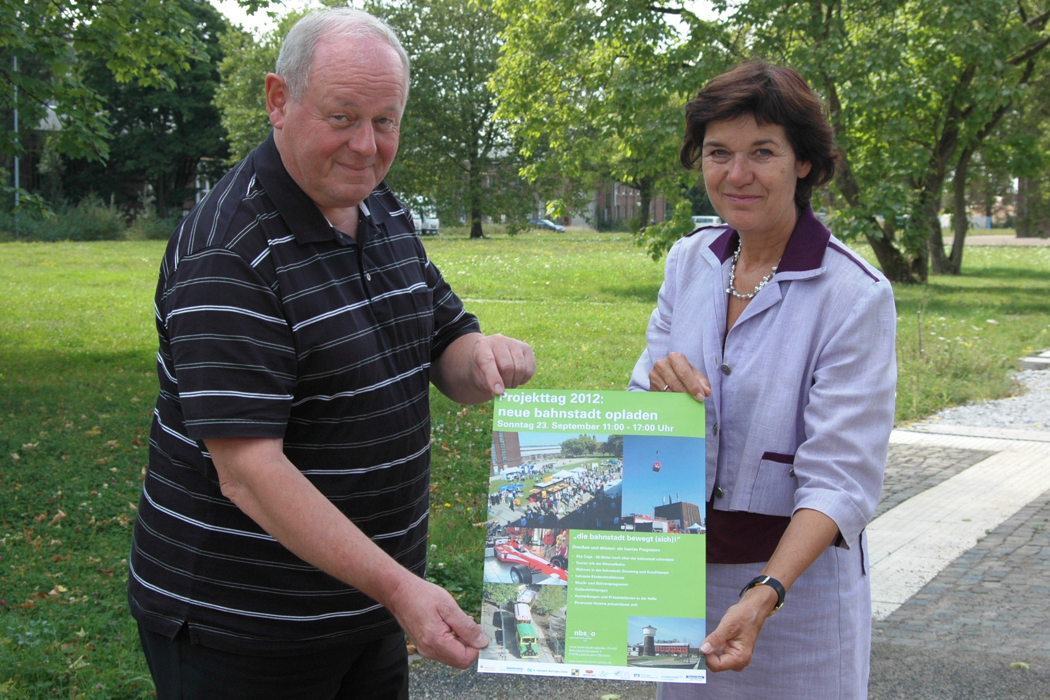 Paul Hebbel und Vera Rottes von der neuen bahnstadt opladen laden alle Leverkusener Bürger zum Projekttag "die bahnstadt bewegt (sich)!" am 23. September ein.