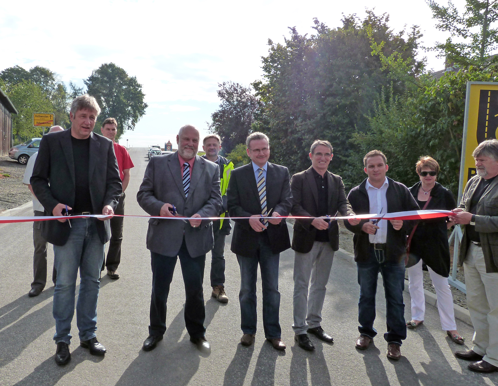 Auf den Bildern sieht man die neue Straße sowie Bürgermeister Michael Wielert (links außen), 1. Beigeordneter Erwin Sedlazek (Fuldatal) und Landrat Uwe Schmidt (dritter von links) bei der Freigabe.