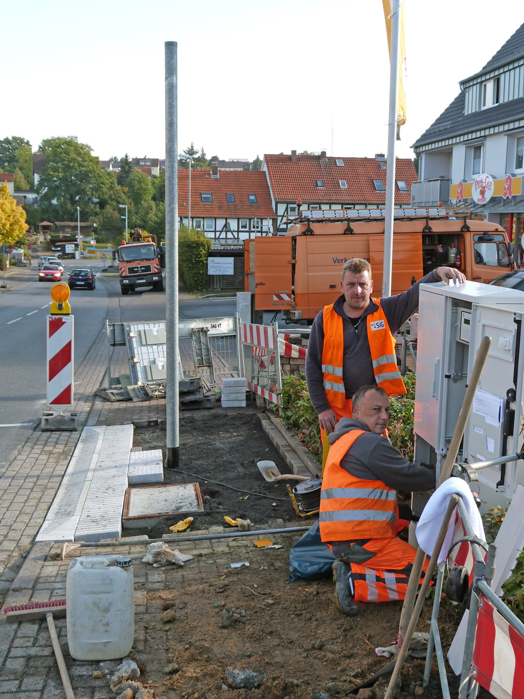 Auf dem Foto sieht man Michael Rosenthal (stehend) und Manfred Braun, die sich um die neue Ampelschaltung kümmern.
