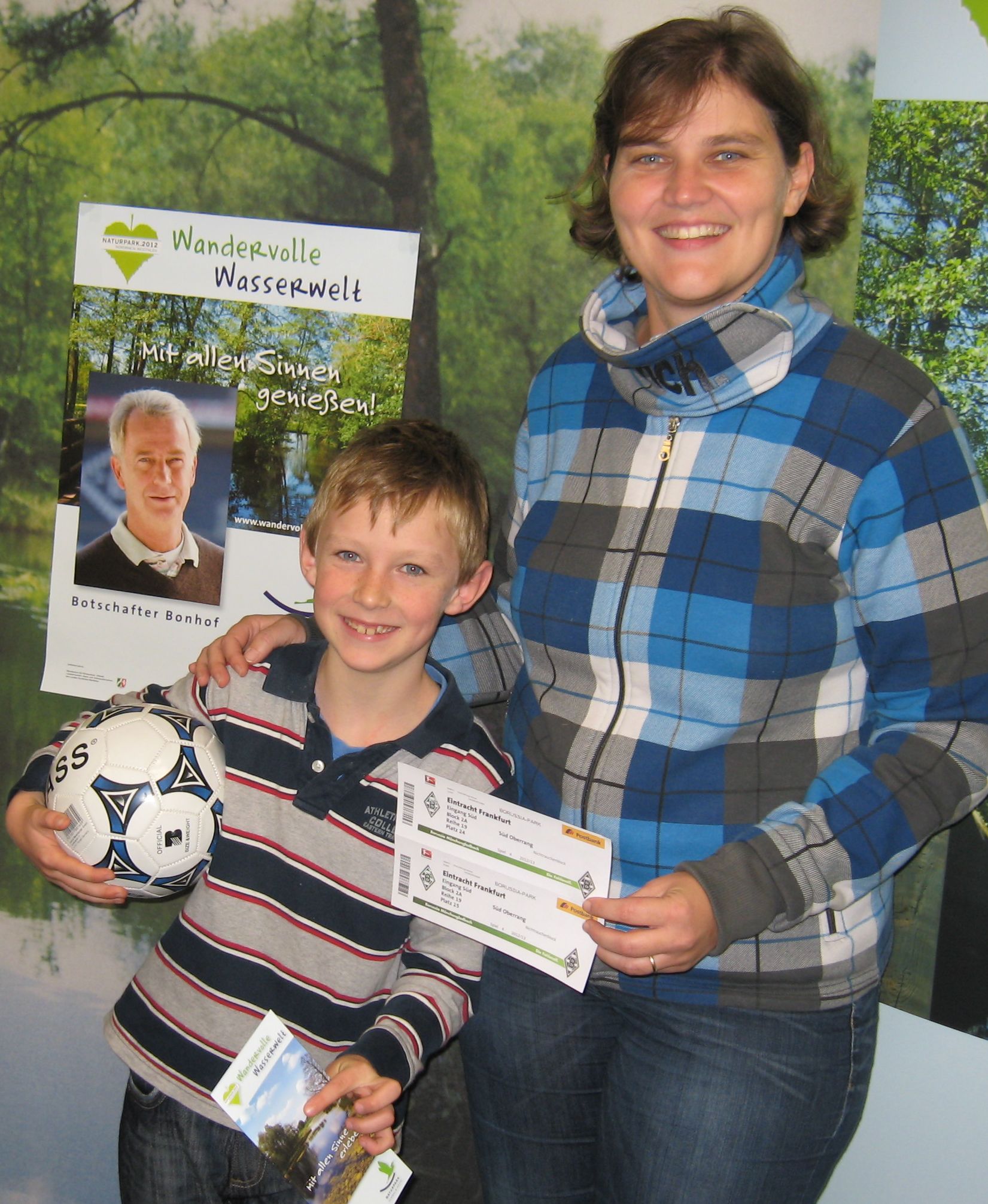 Rene Baumann und seine Mutter Andrea aus Kempen holen sich in der Naturpark-Schwalm-Nette-Geschäftsstelle in Viersen die Freitickets fürs Bundesligaspiel am Sonntag im Borussiapark ab. Botschafter Bonhof hat 6 Freikarten spendiert. Foto: Naturpark Schwalm-Nette / Abdruck honorarfrei