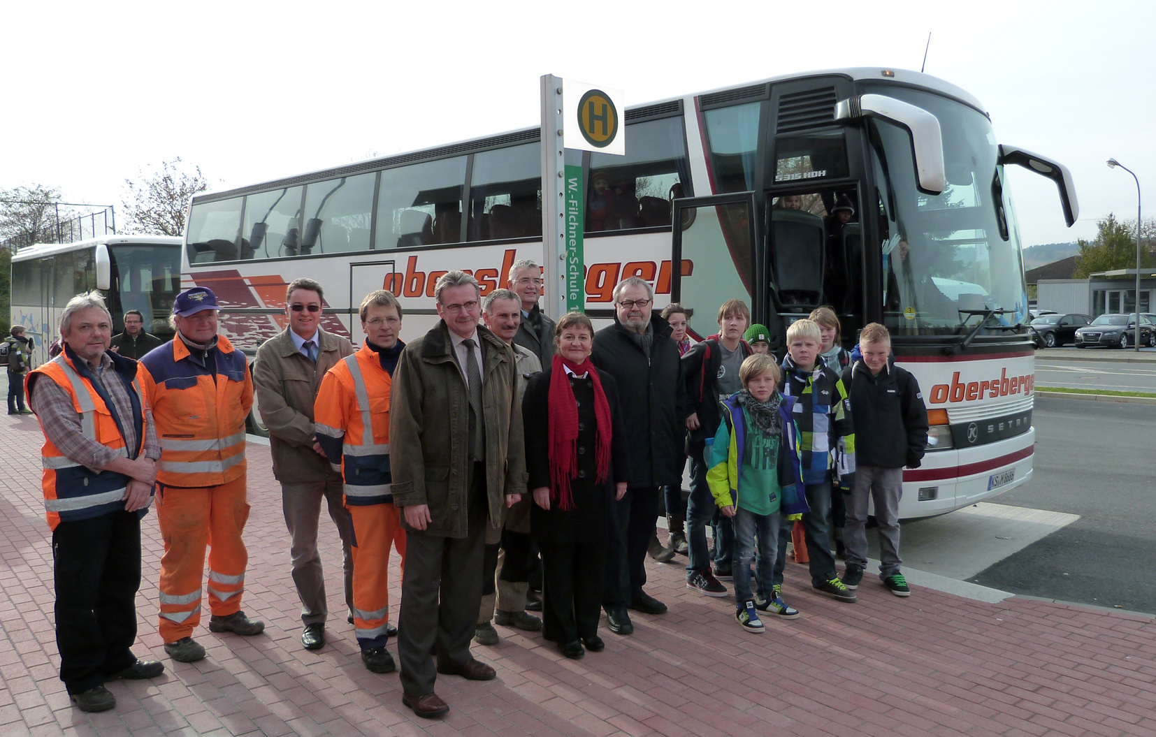 Auf dem Foto sieht man Landrat Uwe Schmidt (5. von links), Schulleiterin Rita Schmidt-Schales (Wilhelm-Filchner-Schule/mit dem roten Schal in der Mitte) und Ersten Stadtrat Horst Förste (rechts neben Schmidt-Schales) an der neuen Bushaltestelle.