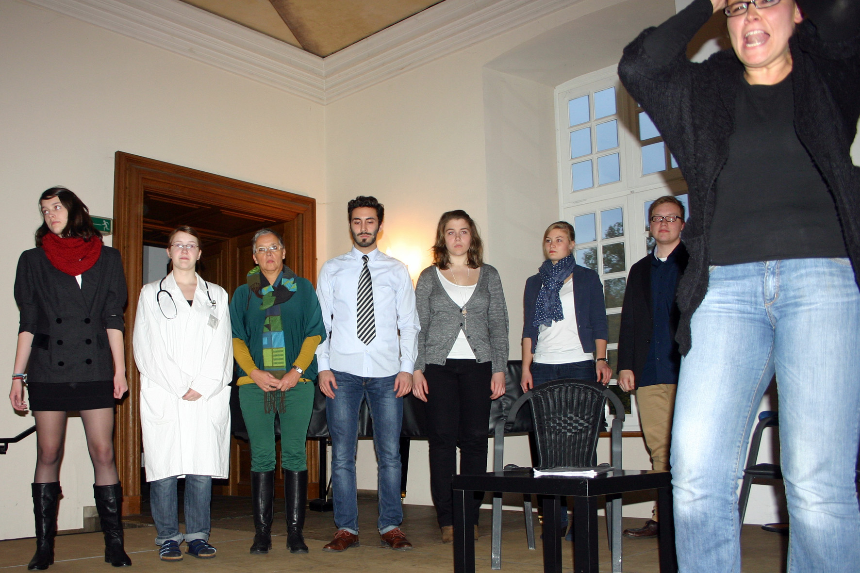Theaterstück gegen Gewalt an Frauen: Katrin Wolf spielte die geschlagene Frau, die viele bürokratische Wege gehen muss, bevor ihr geholfen wird.