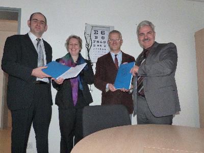Auf dem Foto sieht man von links nach rechts Bertrand Souquet (Regionalbevollmächtigter der Krankenversicherung MGEN), Vizelandrätin Susanne Selbert, Eric Correia (Vorsitzender der LAG Pays de Gueret) und Rüdiger Henne (Vorsitzender der KulturLandschaft HessenSpitze).