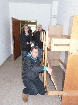 Auf dem Foto sieht man Hausmeister Rolf Reining (im Vordergrund), Vizelandrätin Susanne Selbert und Armin Pfeiffer (Hausmeister Pommernanlage) beim "Betten bauen".