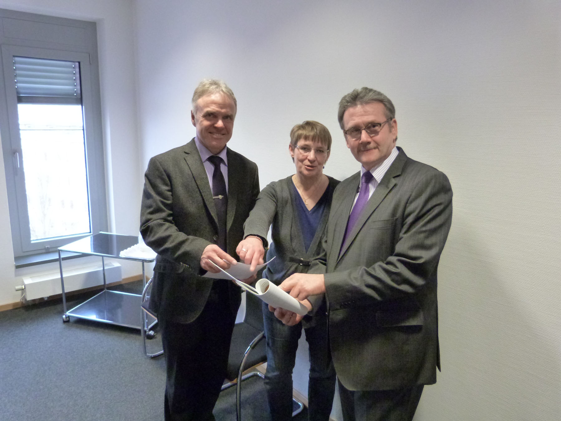 Auf dem Foto freuen sich der Wolfhager Bürgermeister Reinhard Schaake, Regionalmanagerin Ute Raband und Landrat Uwe Schmidt.