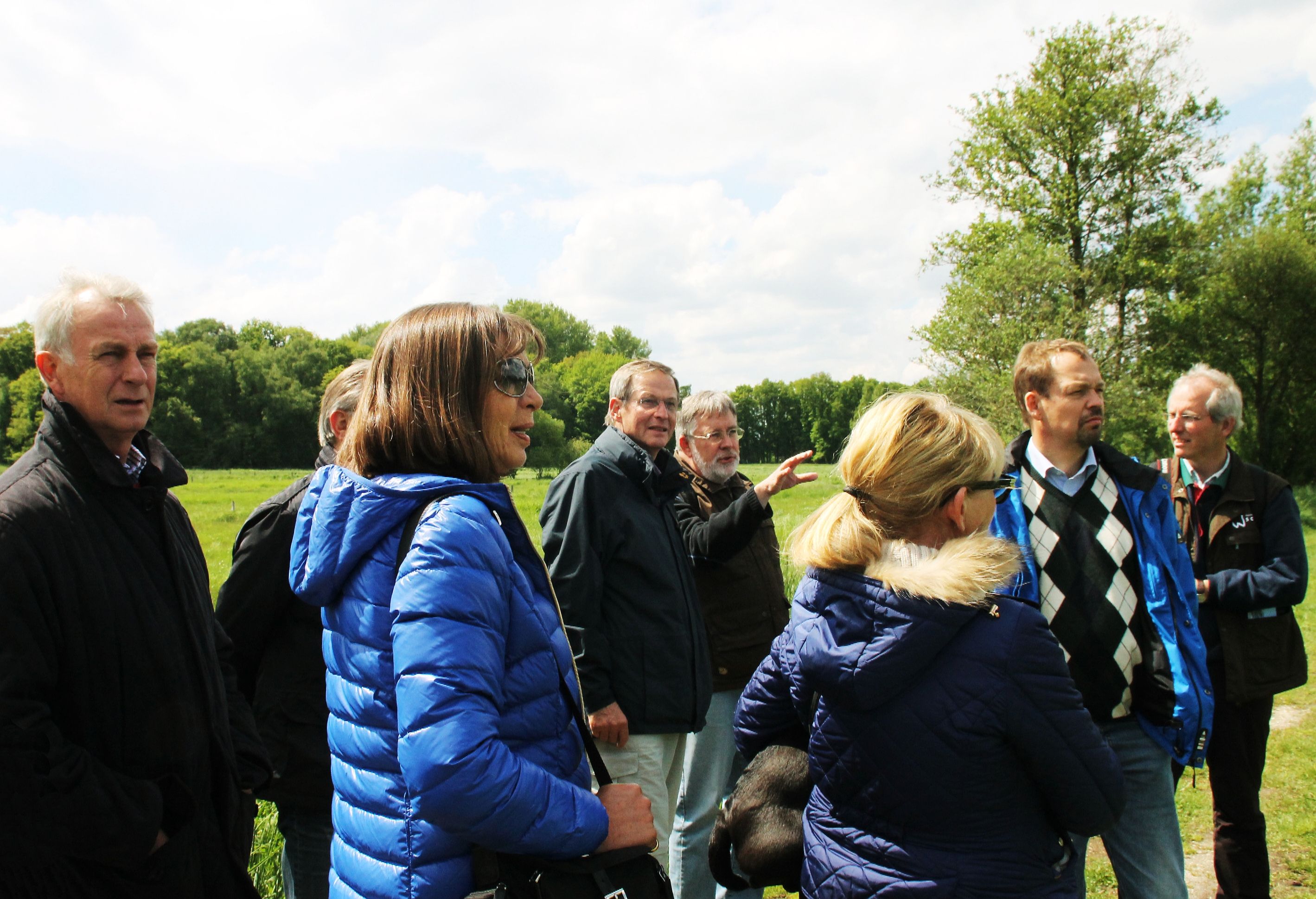 Die Wanderscouts Bernd Nienhaus (4.v.r.) und Michael Puschmann (r.) geben auf der Zwei-Seen-Runde im Naturschutzgebiet Tantelbruch Erläuterungen. Aufmerksame Zuhörer sind Rainer Bonhof (r.), Naturpark-Verbandsvorsteher Peter Ottmann (5.v.r.) und Dr. Ferdinand Schmitz (2.v.r.), Vorsitzender der Verbandsversammlung. Foto: Axel Küppers / Abdruck honorarfrei