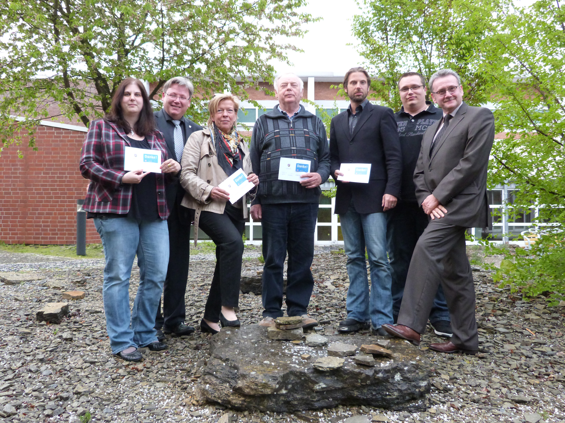 Auf dem Foto sieht man von links nach rechts Carola Göhlich, Bürgermeister Ralf Pfeiffer, Barbara Sörries-Herrnkind, Theo Stephan, Dimitri Raabe, Sascha Göhlich und Landrat Schmidt.