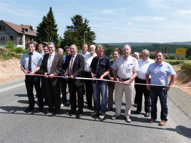 Auf dem Bild der Straßenfreigabe von links: Herr Baumhör von Hessen Mobil, Herr Landrat Schmidt, Herr Bürgermeister Schaub und Mitarbeiter der Firma Bauer
