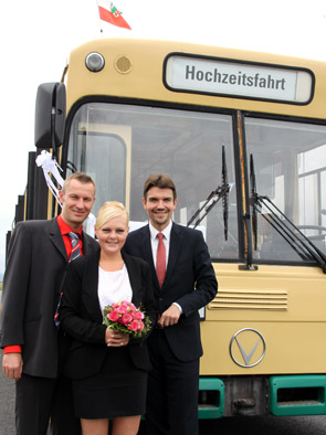 Ja! – Dieses besondere Wort haben sich Lisa-Katharina Roggow und Dennis Bretscher auf der Halde Hoheward gegeben. Als erstes Paar heirateten die beiden in der neusten Hochzeitslocation des Hertener Standesamtes: In einem historischen Hochzeitsbus. Der prominente Standesbeamte war Bürgermeister Dr. Uli Paetzel persönlich.