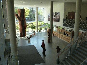 Auf den Fotos sieht man Eindrücke von der Ausstellungseröffnung und der Skulpturen im Foyer sowie ein Bild von Heinrich J. Wawryk und Vizelandrätin Selbert.