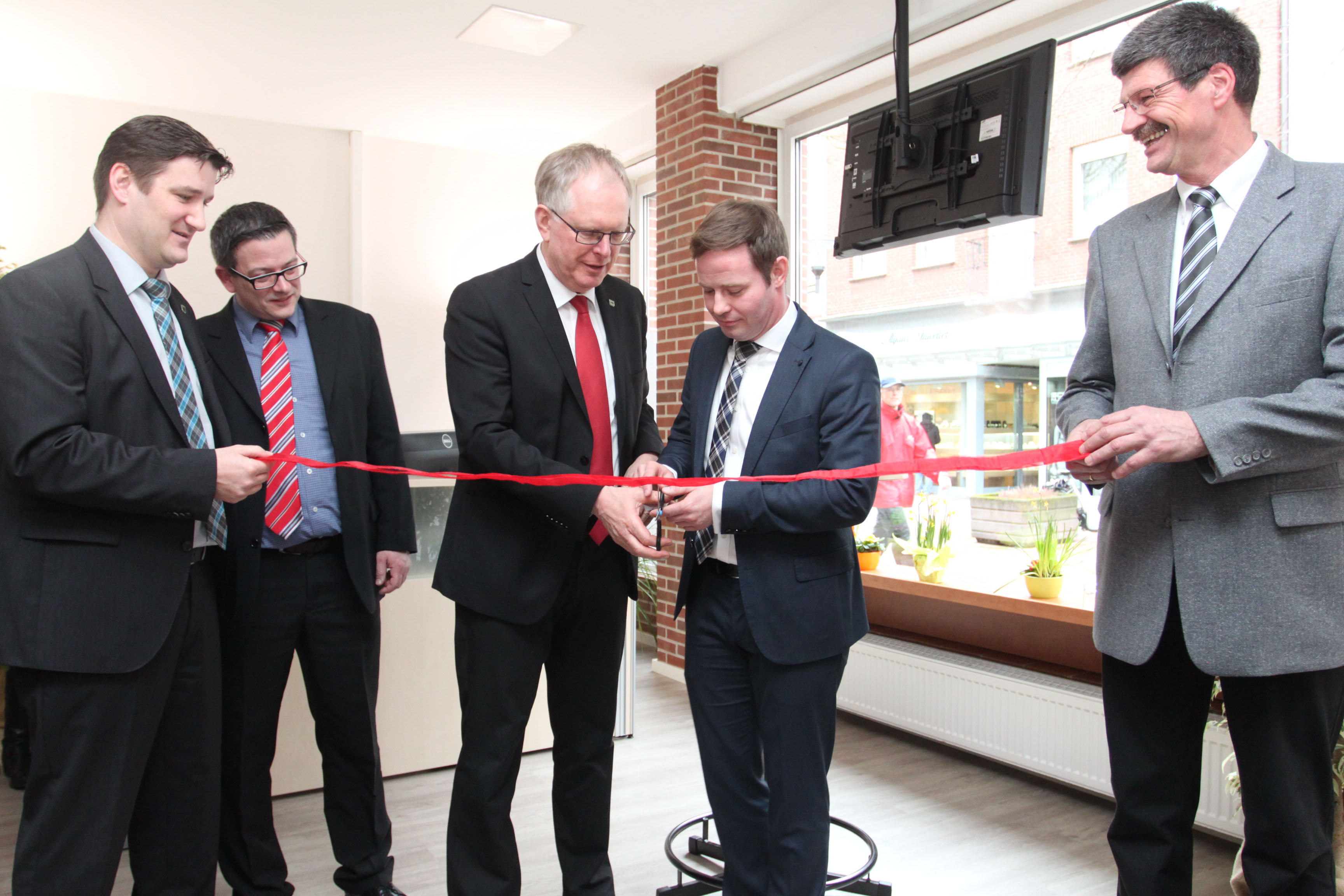 Landrat Cay Süberkrüb eröffnet am 13. Februar 2014 den Jobpoint in Dorsten. Auf dem Bild (v.l.): Patrick Hundt (Fachdienstleiter Bereich Markt und Integration), Carsten Taschner (Gesamtkoordinator Vermittlungsservice), Landrat Cay Süberkrüb, Lars Ehm (1. Beigeordneter Stadt Dorsten), Herbert Averkamp (Bezirksstellenleiter Jobcenter in Dorsten).