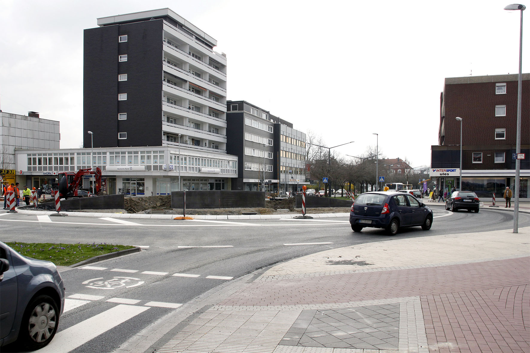 Die ersten Autos fahren durch den Kreisverkehr. Besser hätten die Asphaltarbeiten am Kreisverkehr in der Innenstadt kaum laufen können.