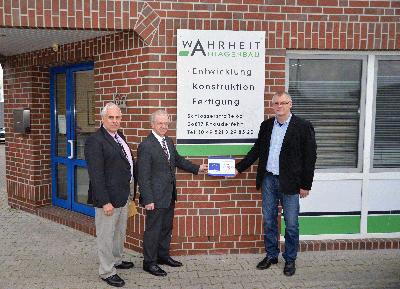 Schildübergabe an Firmeninhaber Ludger Wahrheit (r.) durch Landrat Bernhard Bramlage und Harald Krebs (l.), Leiter der Wirtschaftsförderung beim Landkreis Leer.