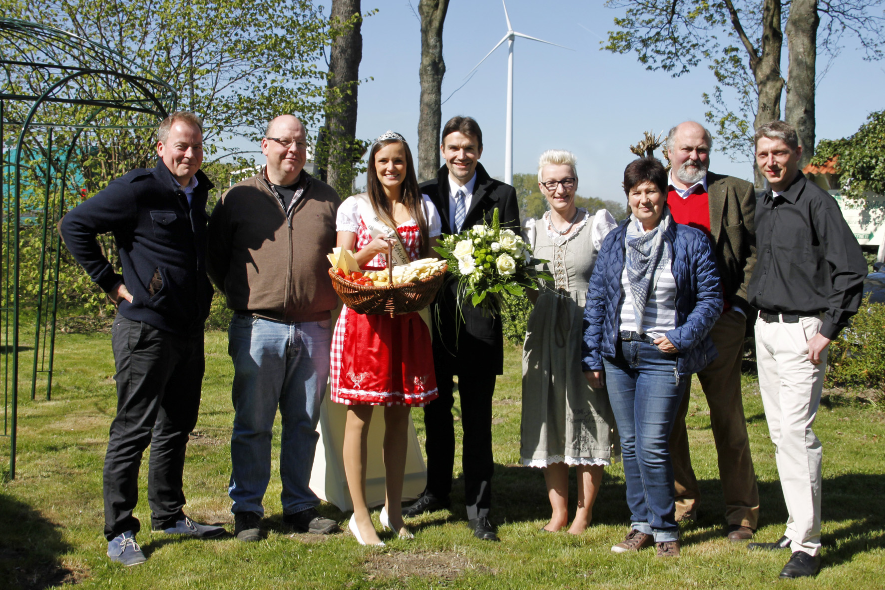 Großer Empfang für die neue Spargelkönigin Christina I.: (v. links) Die Spargelbauern Heiner Schulte Scherlebeck (Spargelhof Schulte Scherlebeck), Dirk Große-Streuer (Brunnenhof in der Ried), Bürgermeister Dr. Uli Paetzel, ehemalige Spargelkönigin Bettina I., Ingrid Franzen (Gartenbaubetrieb Franzen), Willi Heine (Heine Hof) und Frank Südfeld (Bauer Südfeld).