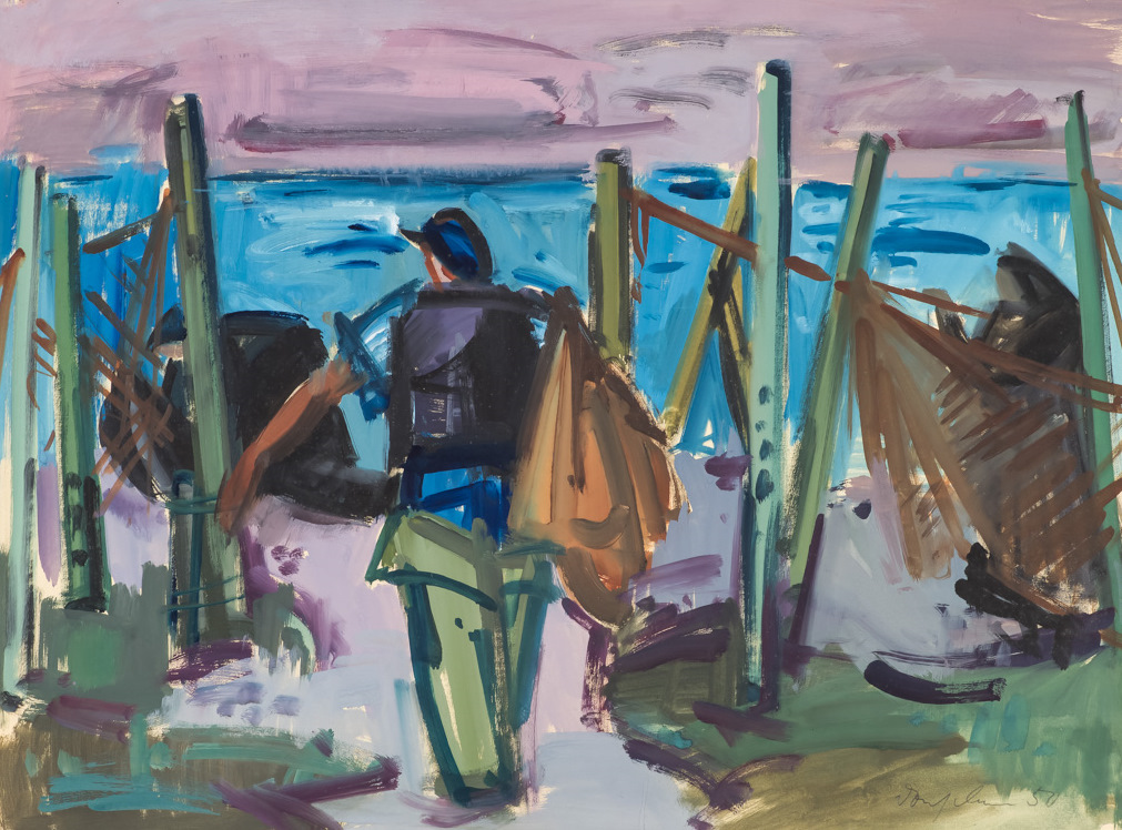 Karl Dönselmann im Sande, Mann mit Netzen, Tempera auf Papier, 1950. © Kunsthaus Leer, J. Bambrowicz