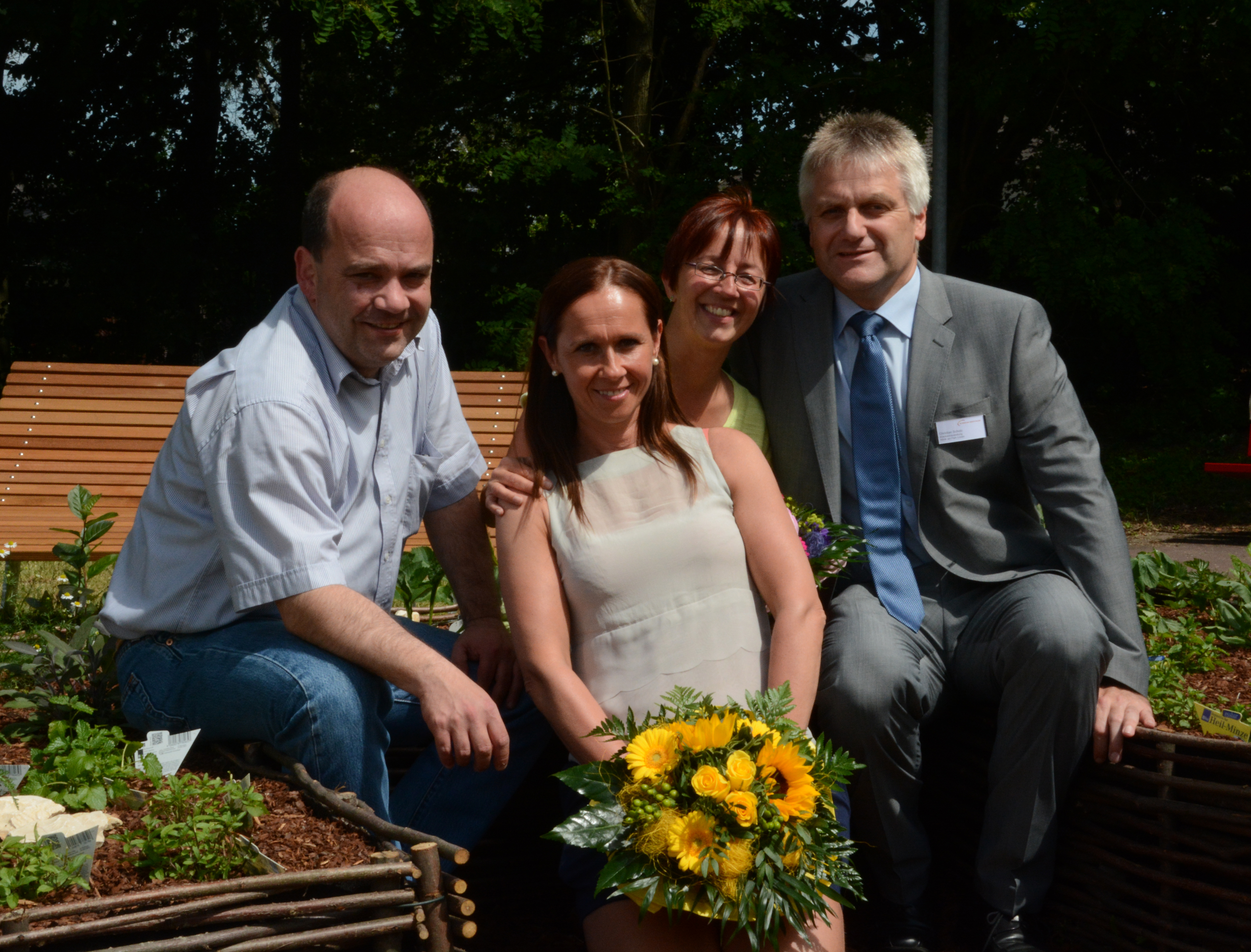 Bild 1: v.l.n.r. Der Geschäftsführer der Klinikums Westfalen Michael Kleinschmidt, die Organisatoren des Kräutertages Karina Lahme und Christiane Peter sowie der Krankenhausleiter der Klinik am Park Christian Scholz beim Gruppenbild am Kräuterbeet