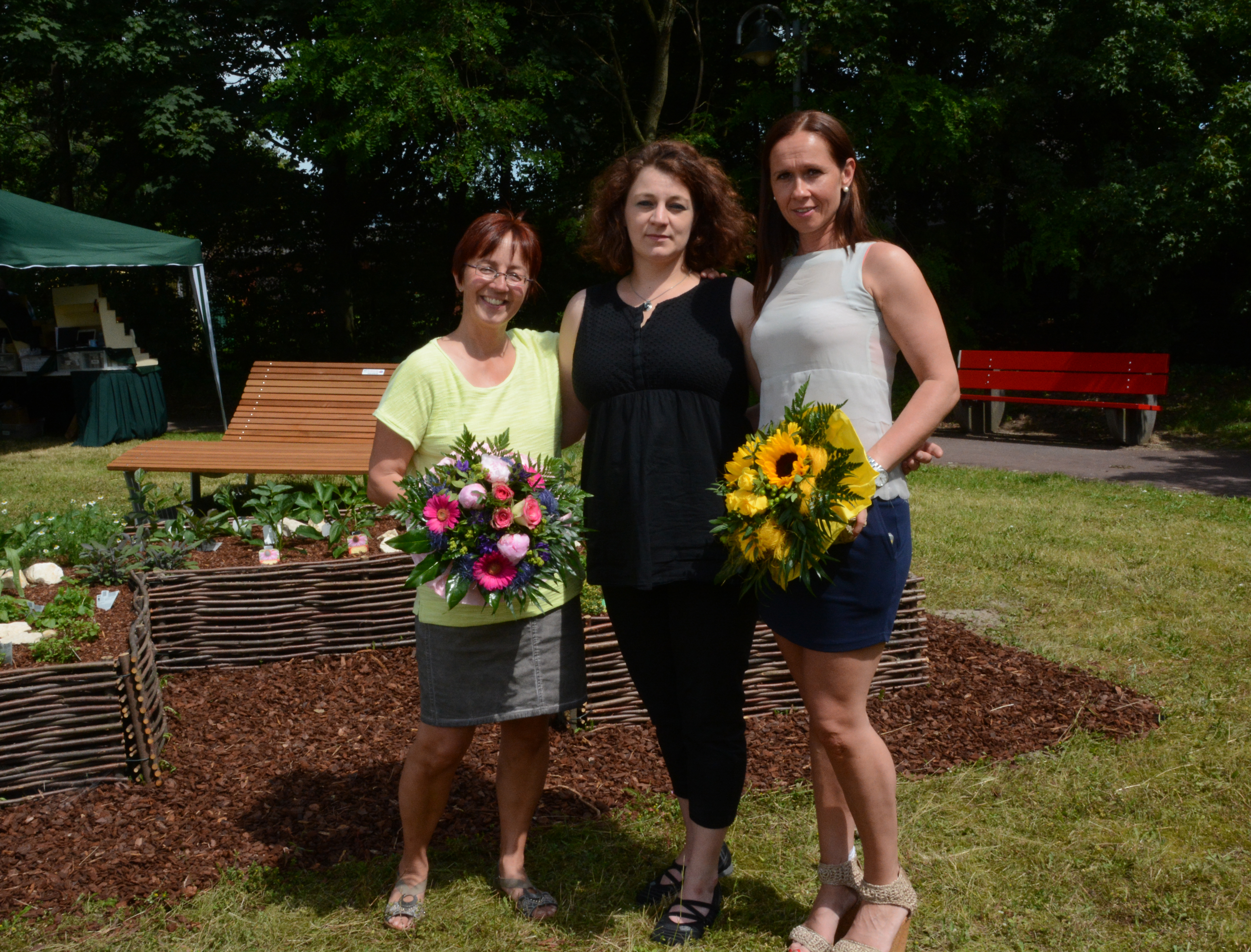 Bild 2: Die Anästhesieschwestern und Organisatorinnen des Kräuter- und Gesundheitstages Karina Lahme und Christiane Peter bedankten sich bei der Vertreterin der Gärtnerei Dahlke aus Lünen-Brambauer für die Realisierung des hauseigenen Kräuterbeetes.