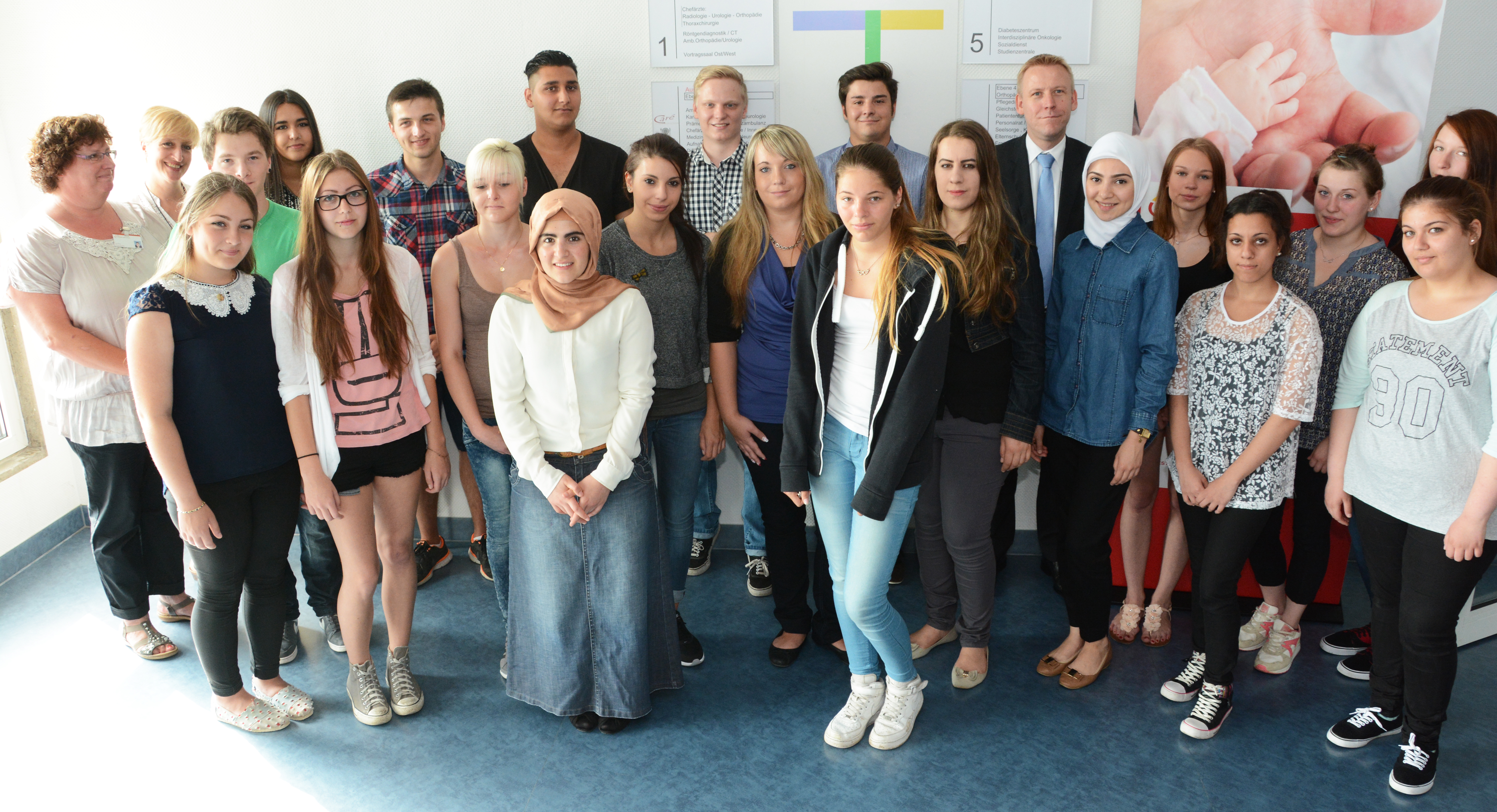 28 junge Menschen starten am Knappschaftskrankenhaus in ihre berufliche Zukunft. Zum Start begrüßten sie der kaufmännische Direktor des Klinikums Westfalen Sebastian Scheer (hinten Mitte) sowie für die Pflegedienstleitung Anja Schmitz und Heike Kötter (v.l.).