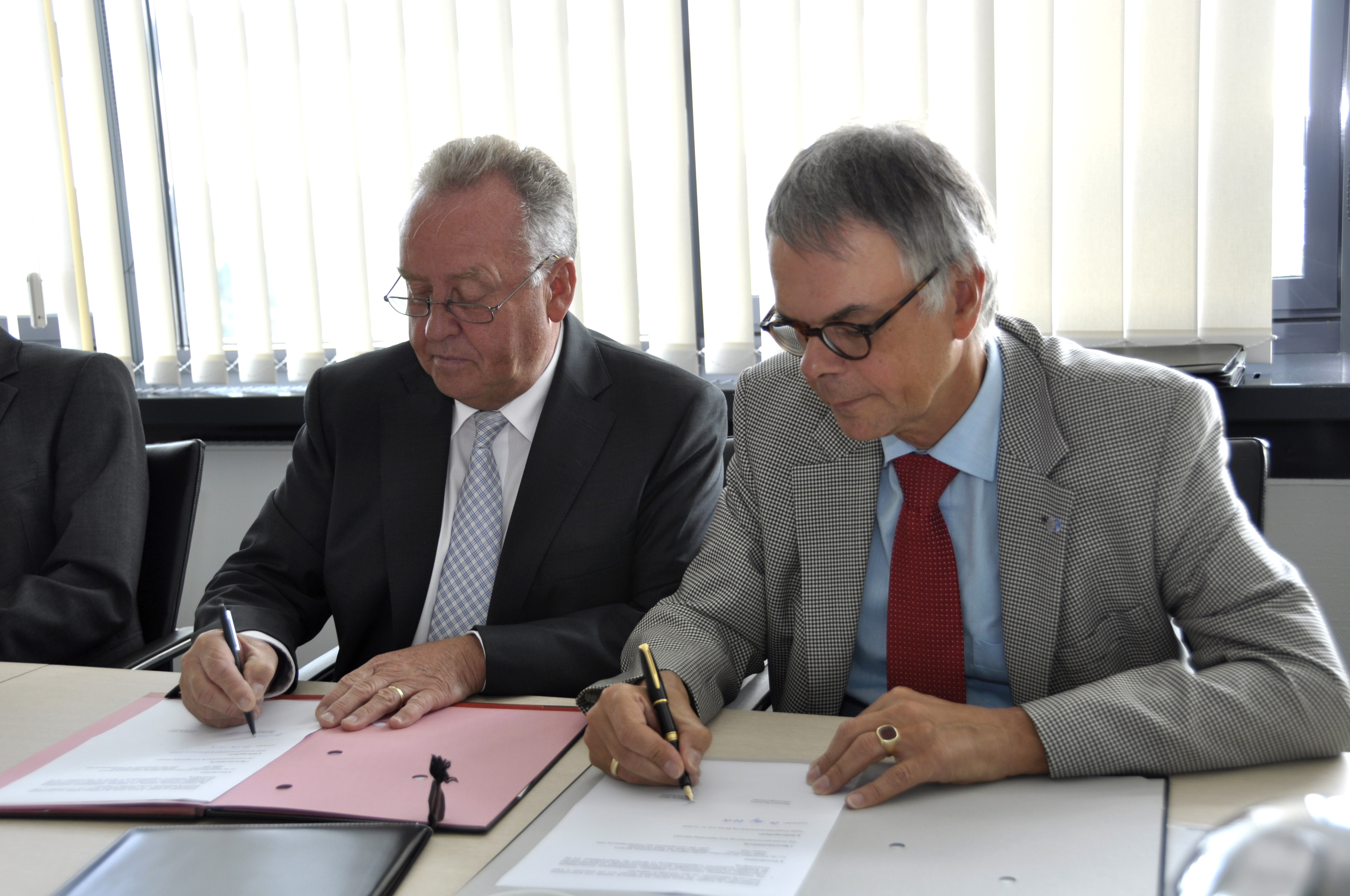 Oberbürgermeister Reinhard Buchhorn und Polizeipräsident Wolfgang Albers setzen ihre Unterschrift unter die Kooperationsvereinbarung.
