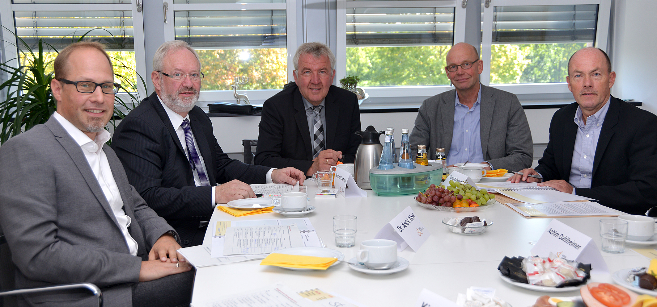 In einem intensiven Diskussionsprozess legten die Jurymitglieder die Gewinner fest (v. r.): Landrat Thomas Kubendorff, Achim Dahlheimer (NRW-Bauministerium), Franz-Josef Konermann (VR-Bank Kreis Steinfurt eG), Hermann Lastring (Volksbank Ochtrup) und Dr. André Wolf (Regionale 2016).