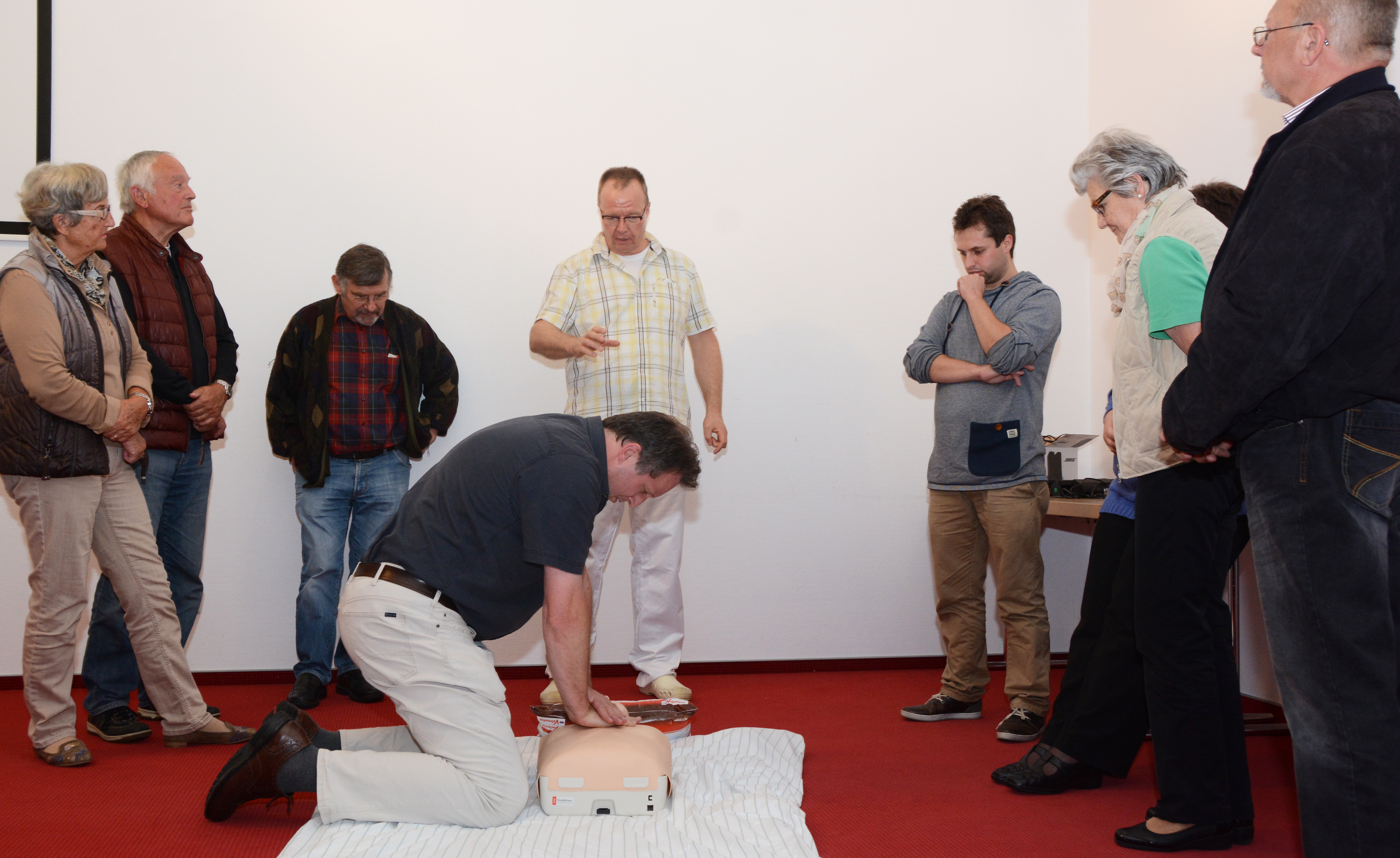 Im Knappschaftskrankenhaus Dortmund frischten Interessierte im Rahmen der Woche der Wiederbelebung ihre Kenntnisse für den Ernstfall auf. Bildmitte: Dr. Udo Schniedermeier