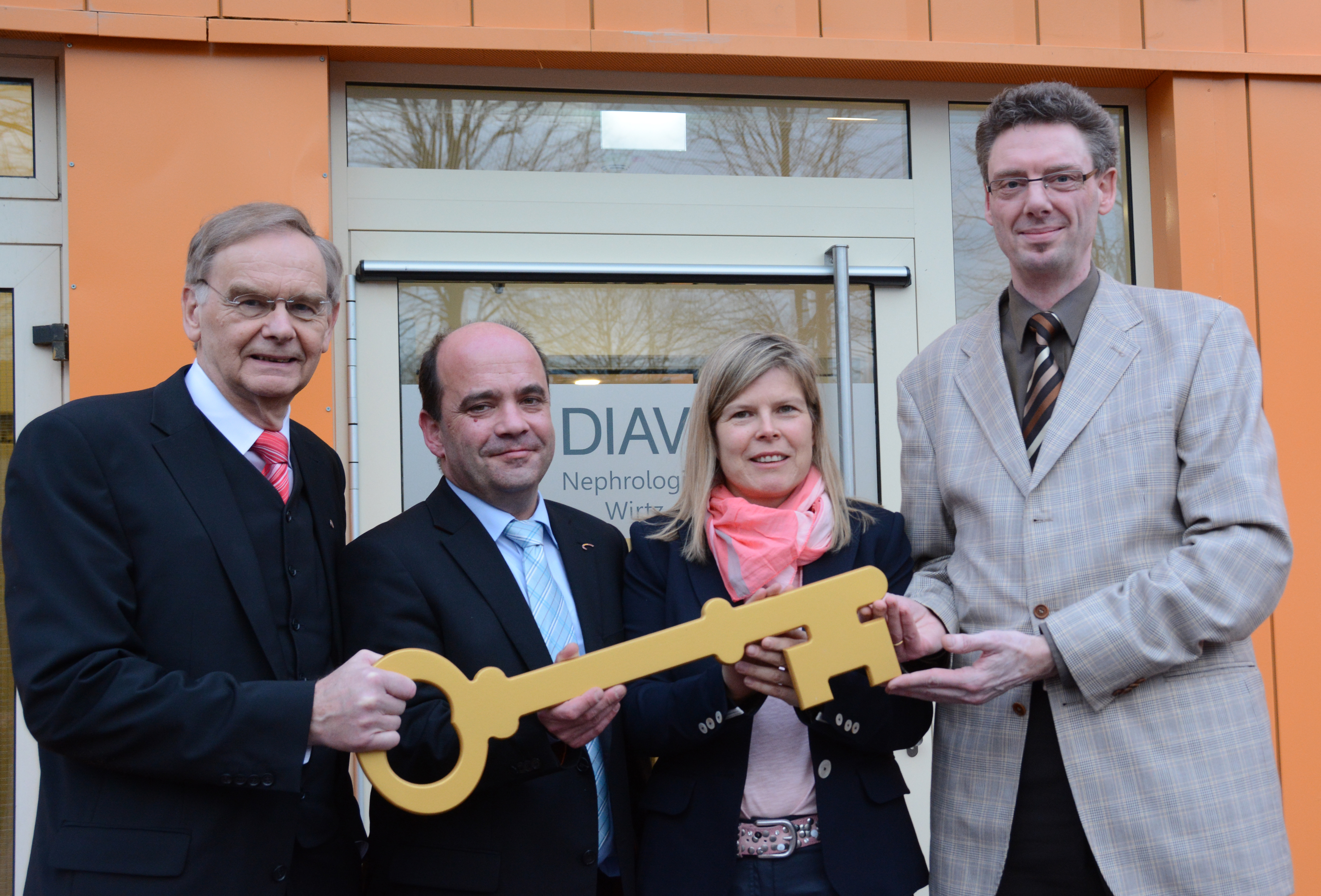 Symbolische Schlüsselübergabe für das neue Dialysezentrum im Hellmig-Krankenhaus mit (v.l.) Dr. Georg Greve (1. Direktor Knappschaft-Bahn-See), Michael Kleinschmidt (Geschäftsführer Klinikum Westfalen) sowie Georg Wirtz und Christiane Pätzold (Diavital).