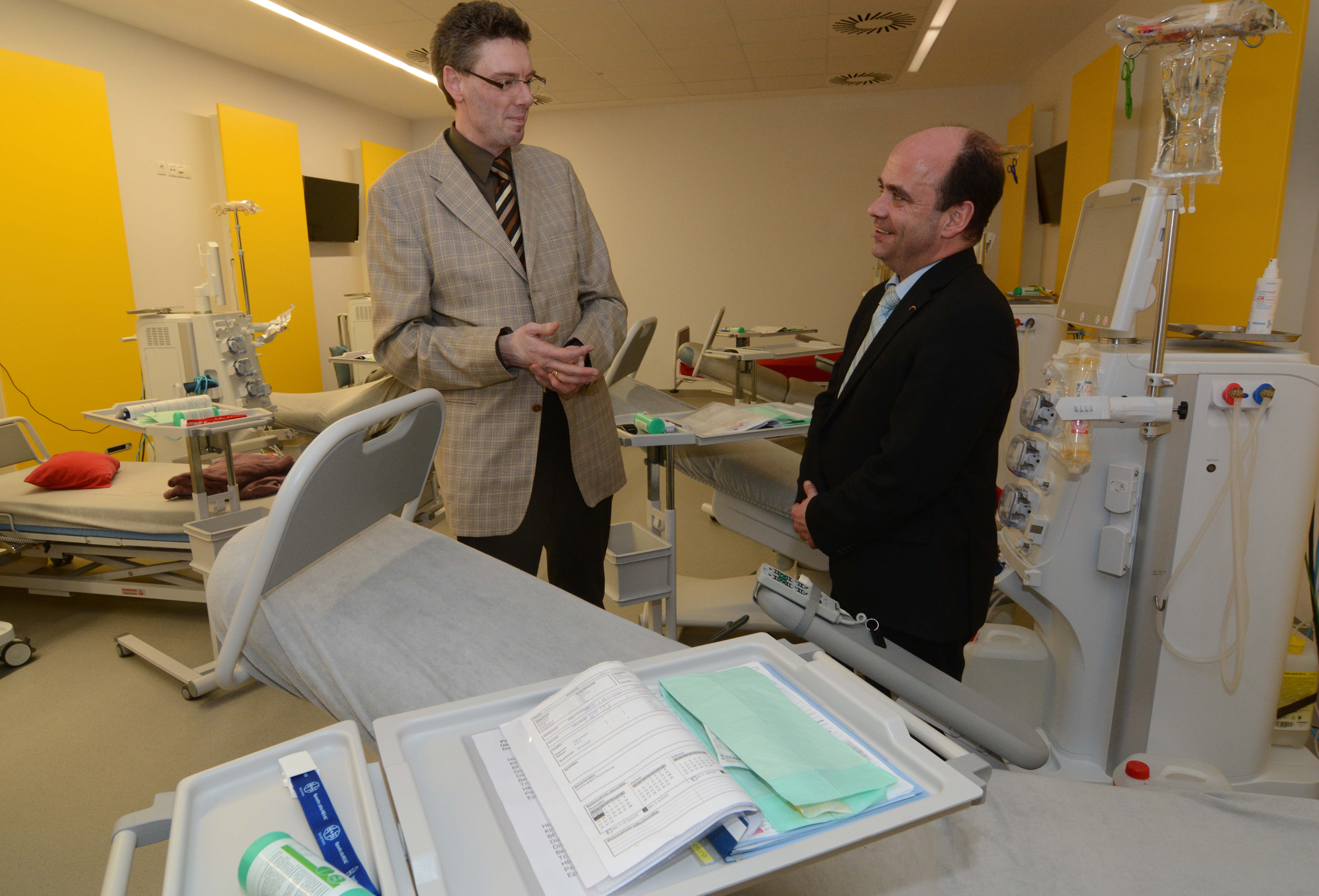 Diavital-Geschäftsführer Georg Wirtz und Michael Kleinschmidt, Geschäftsführer des Klinikums Westfalen beim Gang durch die Räume des neuen Dialysezentrums.