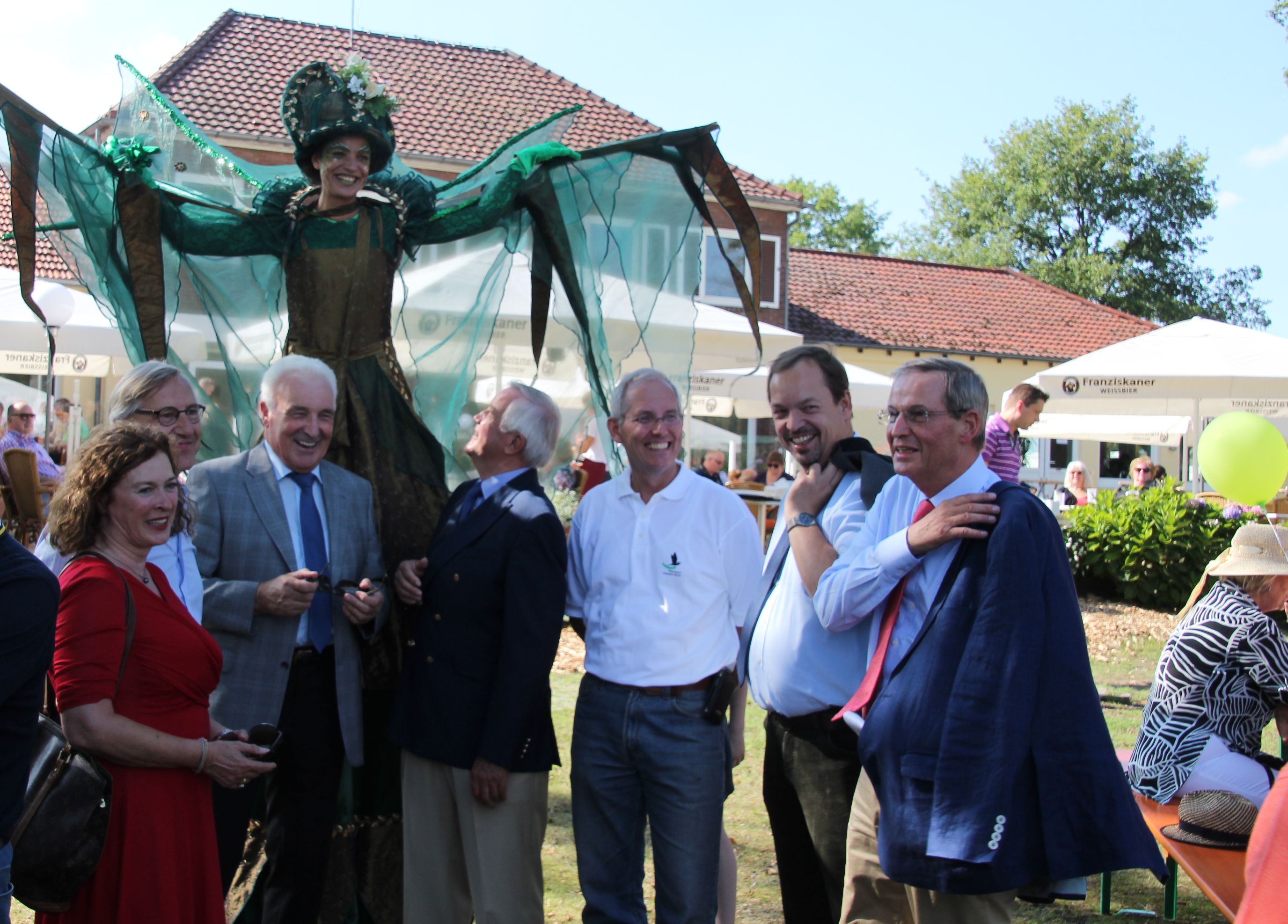 Von der überlebensgroßen und der Natur nachempfundenen Animationsfigur lassen sich beim Sommerfest des Naturparks Schwalm-Nette gerne becircen (v.r.): Verbandsvorsteher Peter Ottmann; Dr. Ferdinand Schmitz, Vorsitzender der Verbandsversammlung; Naturpark-Geschäftsführer Michael Puschmann, Christian Weisbrich, Förderverein-Vorsitzender der Biologischen Station Krickenbecker Seen; Otto Birkmann, stellvertretender Bürgermeister von Kempen; Drs. Leo Reyrink, Geschäftsführer des Naturparks Maas-Schwalm-Nette, und dessen Partnerin Sylvia Erkens. Foto: Axel Küppers / Abdruck honorarfrei