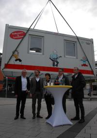 Das Klassenzimmer fliegt ein: Peter und Gabriele Bender, Geschäftsführer von Bender Recycling / Bender Carparts, übergaben es gemeinsam mit Klaus Niesen (li.) an Oberbürgermeister Uwe Richrath (2. v.l.) und Sozialdezernent Markus Märtens (re.).