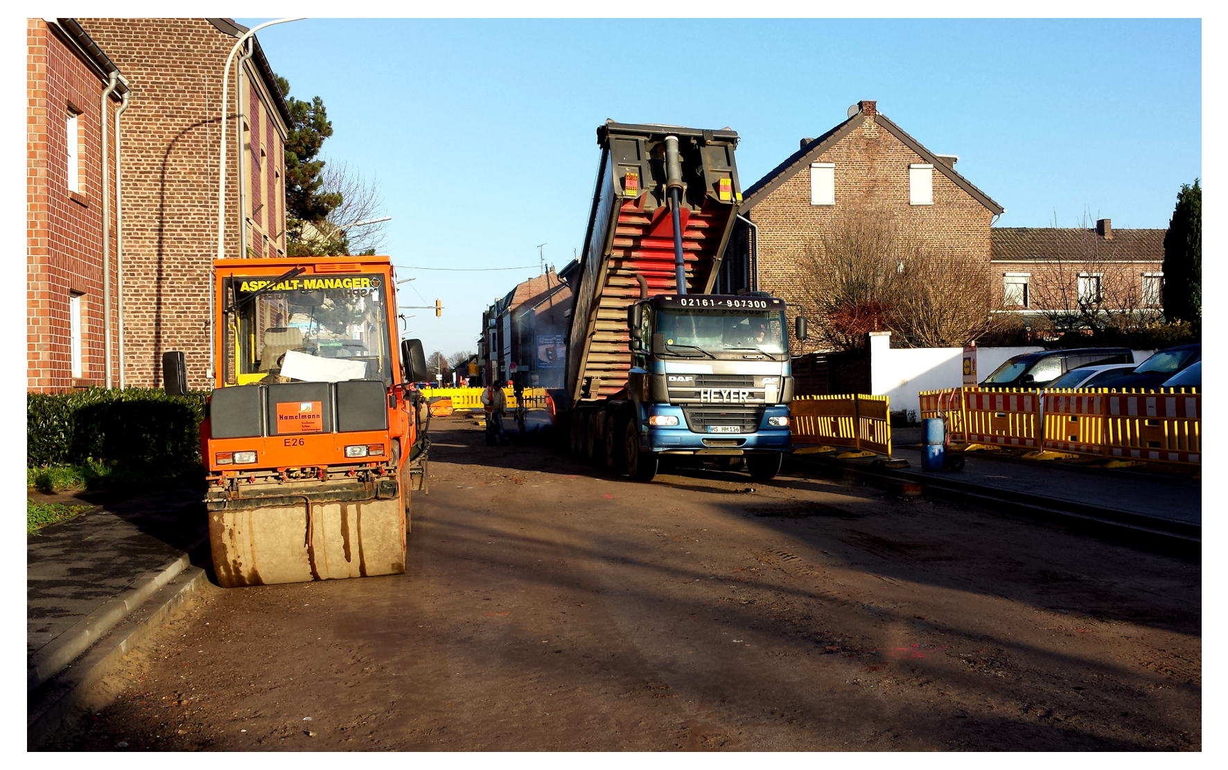 Mitarbeiter der Bauunternehmung Hamelmann aus Kempen führen Asphaltarbeiten im dritten Bauabschnitt der Niedieckstraße durch. Die Freigabe für den Verkehr ist für Mittwoch, 16. Dezember, vorgesehen. Foto: Kreis Viersen / Abdruck honorarfrei