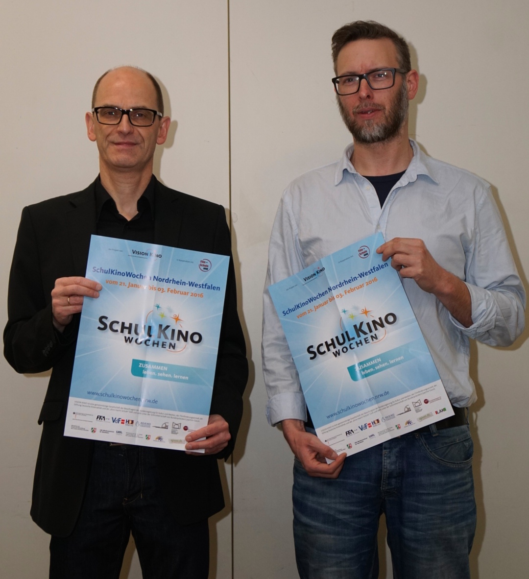 Bernd Nückel (l.) und Medienberater Elmar Wulff präsentieren den Flyer der „SchulKinoWochen NRW“. / Foto: Medienzentrum HSK