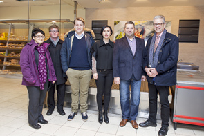 Fachbereichsleiter Peter Brautmeier, Inhaber Cenk Ulu mit seiner Frau, Vermieter Marcel Licht, Martin Marzalla von der Werbegemeinschaft Langenbochum sowie Frauke Wiering von der Hertener Wirtschaftsförderung freuen sich über das neue Lebensmittelangebot im Stadtteilzentrum Langenbochum.(v.l.)