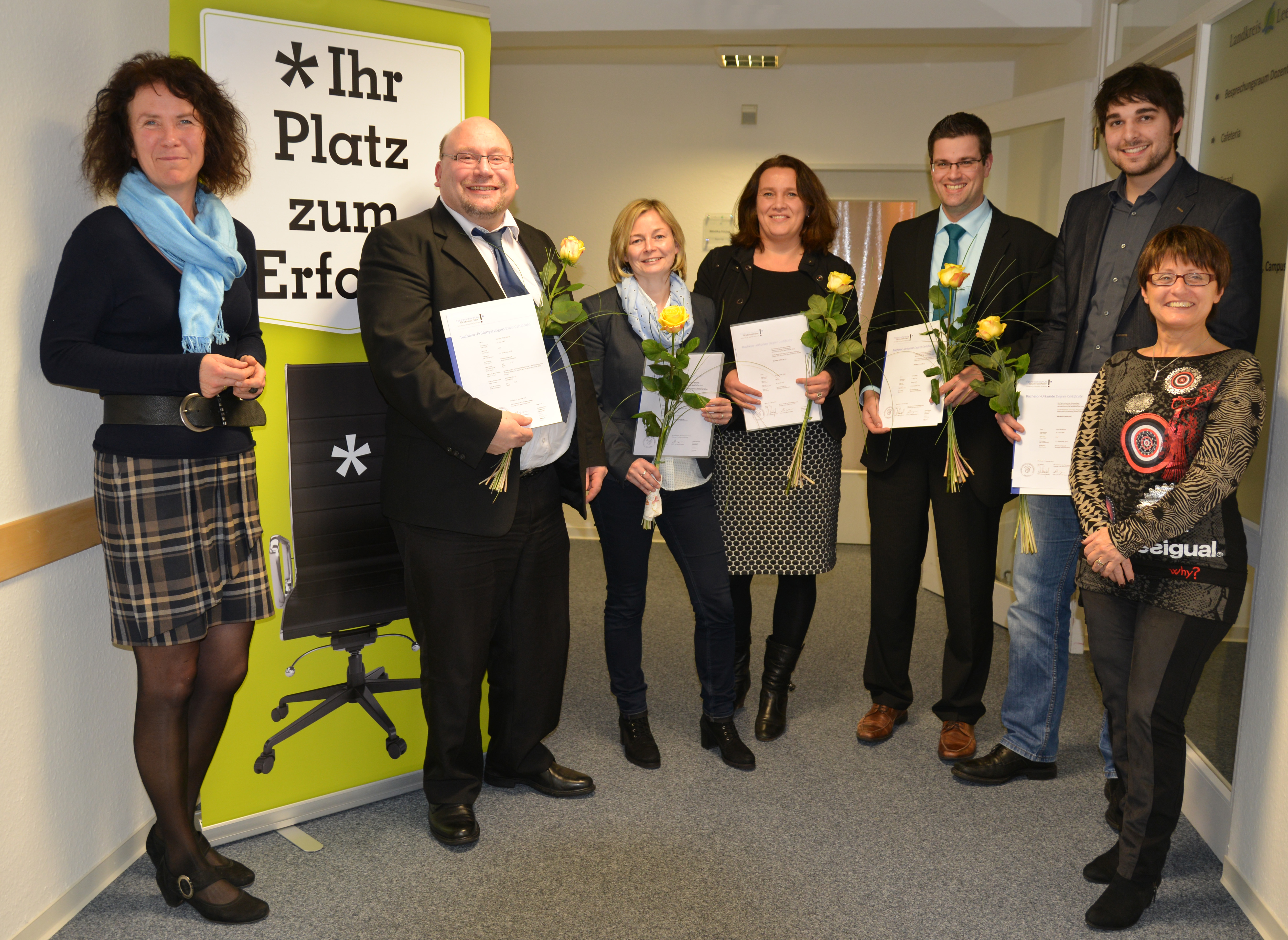 VWA-Geschäftsführerin Monika Fricke (v.l.), die Bachelor-Absolventen: Joachim Jelken aus Rhauderfehn, Regina Schwarz aus Oldenburg, Birgit Momberger aus Emden, Jörn Willjes aus Westerstede, Franz Boekhoff aus Detern und VWA-Mitarbeiterin Birgit Wessels. Auf dem Foto fehlt Absolventin Silke van Beckum aus Hamburg.