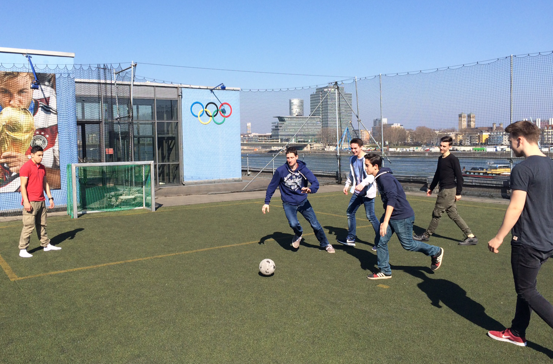 Die Schüler des Bildungsgangs Freizeitsportler nutzen die Mittagspause auf dem Dach des Deutschen Sport- und Olympiamuseums zu einem Fußballspiel. Foto: Rhein-Maas-Berufskolleg Willich / Abdruck honorarfrei