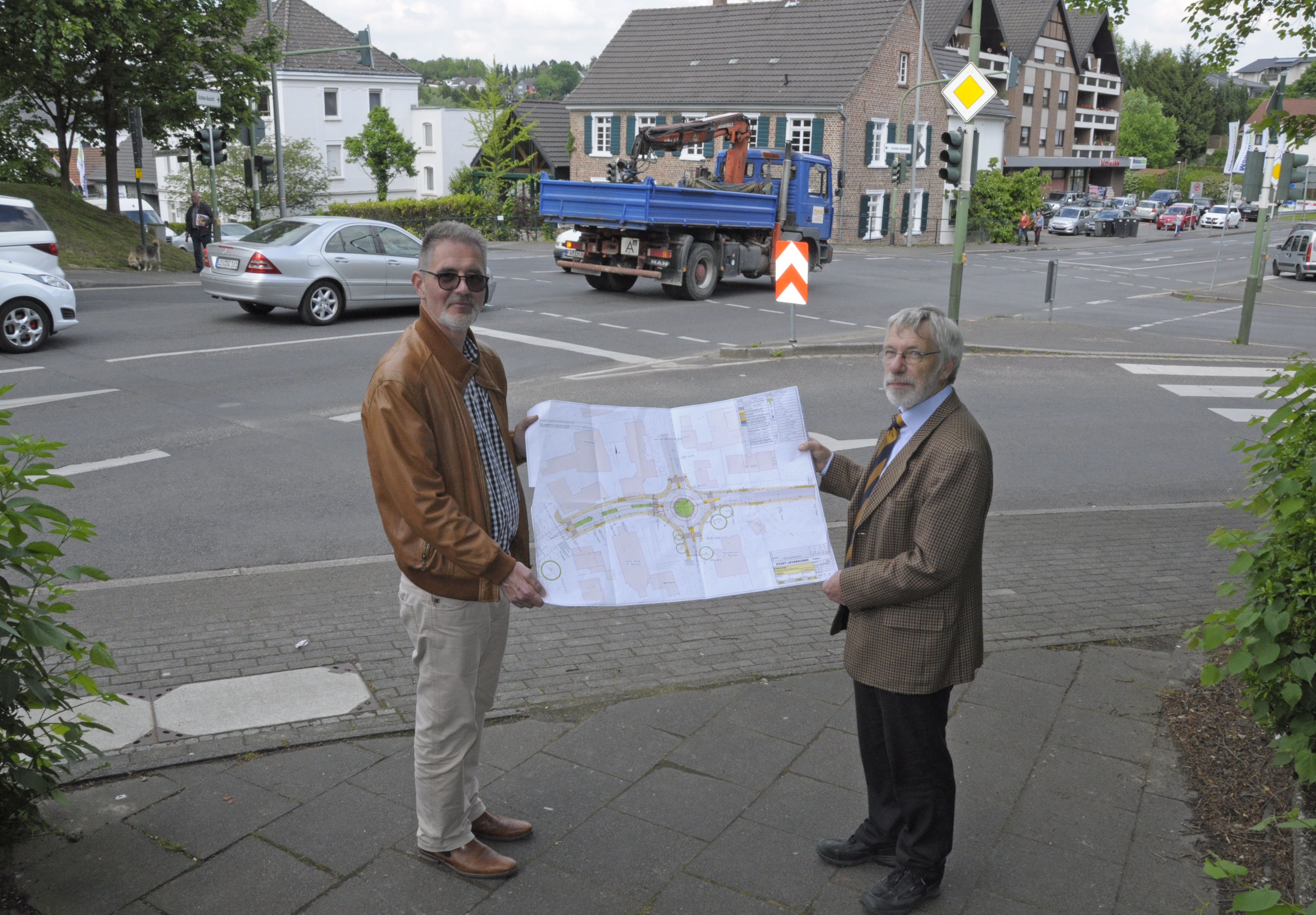 Die heutige Kreuzung wird zu einem Kreisverkehr umgebaut: Christian Syring, Fachbereichsleiter Tiefbau und Wolfgang Herwig (v.l.), Vorstand Technische Betriebem, zeigen auf dem Plan, wie der Verkehr in Zukunft fließen wird.