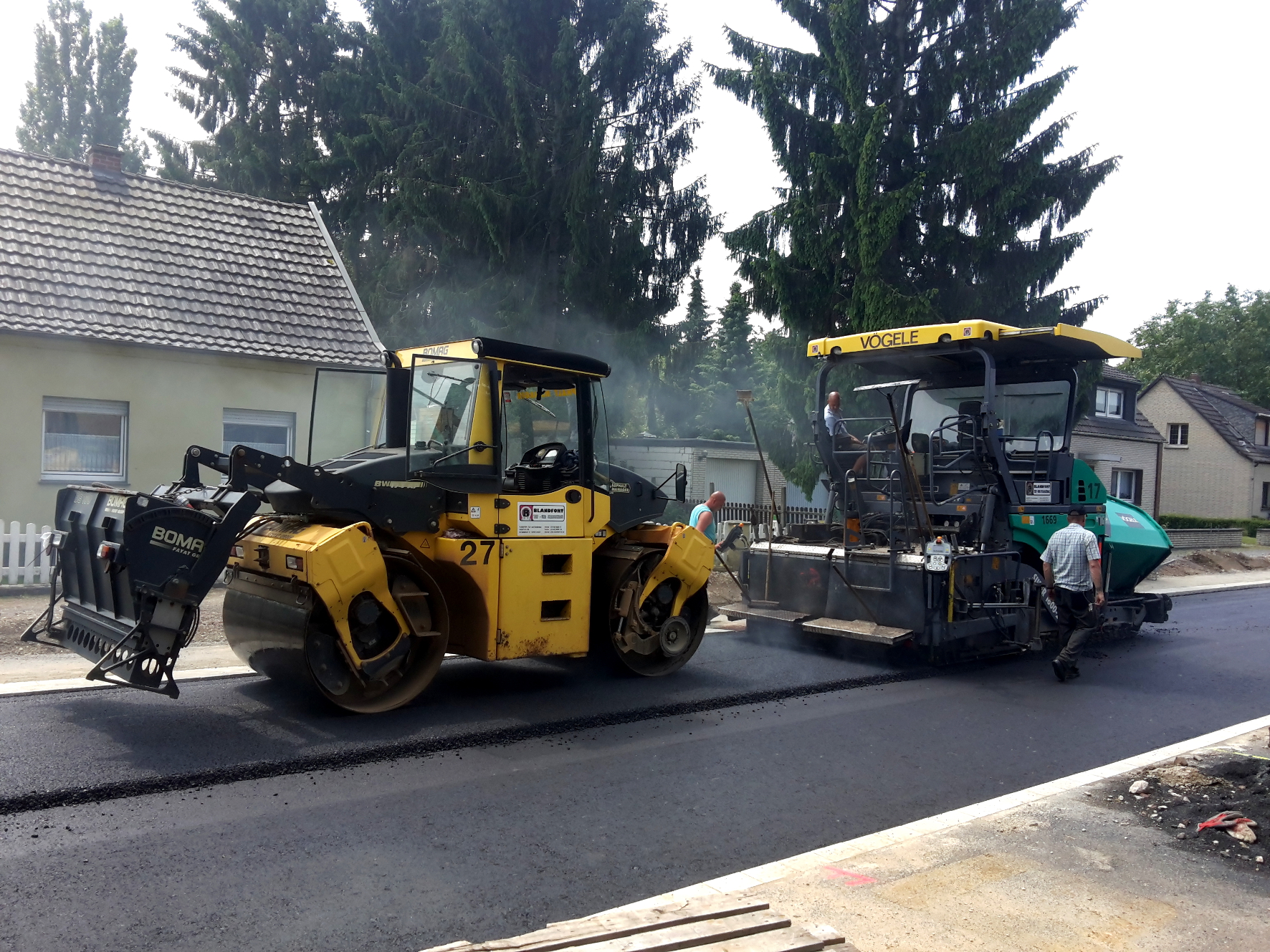 Mitarbeiter der Firma Blandfort bringen die Asphaltschicht im zweiten Bauabschnitt am Donker Weg (K6) in Viersen auf. Foto: Kreis Viersen / Abdruck honorarfrei