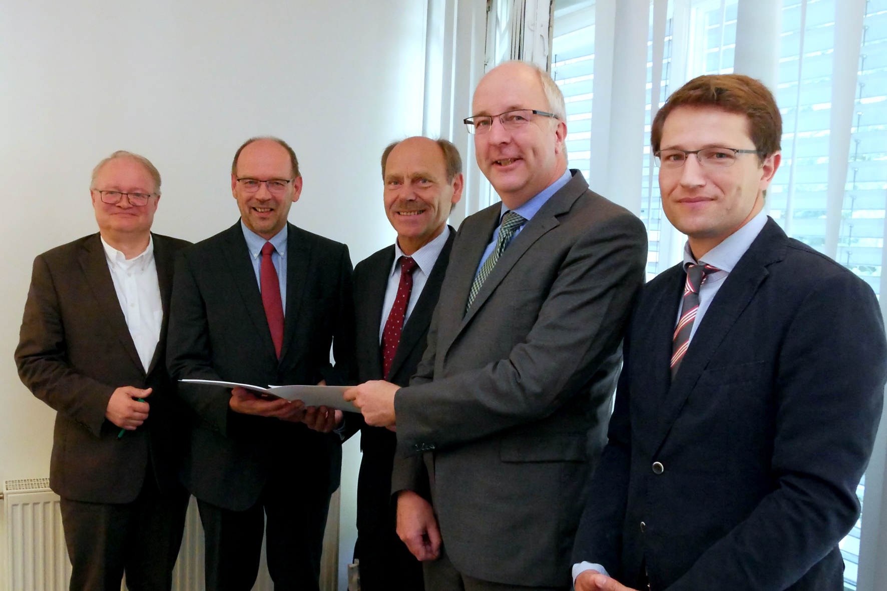 Bildunterschrift: Nikolaus Bley, DGB NRW Bildungswerk e.V. – Projektleiter 'Bündnis zur Bekämpfung von Schwarzarbeit', Rainer Schmeltzer, Minister für Arbeit, Integration und Soziales NRW, Dr. Josef Hülsdünker, Vorsitzender DGB Region Emscher-Lippe, Thomas Harten, Geschäftsführer Wirtschaftsförderung, HWK Münster und Felix Nienhaus, Bezirksregierung Münster (v.l.) bei der Übergabe des Förderbescheides 'Projekt Schwarzarbeit' in Herten.