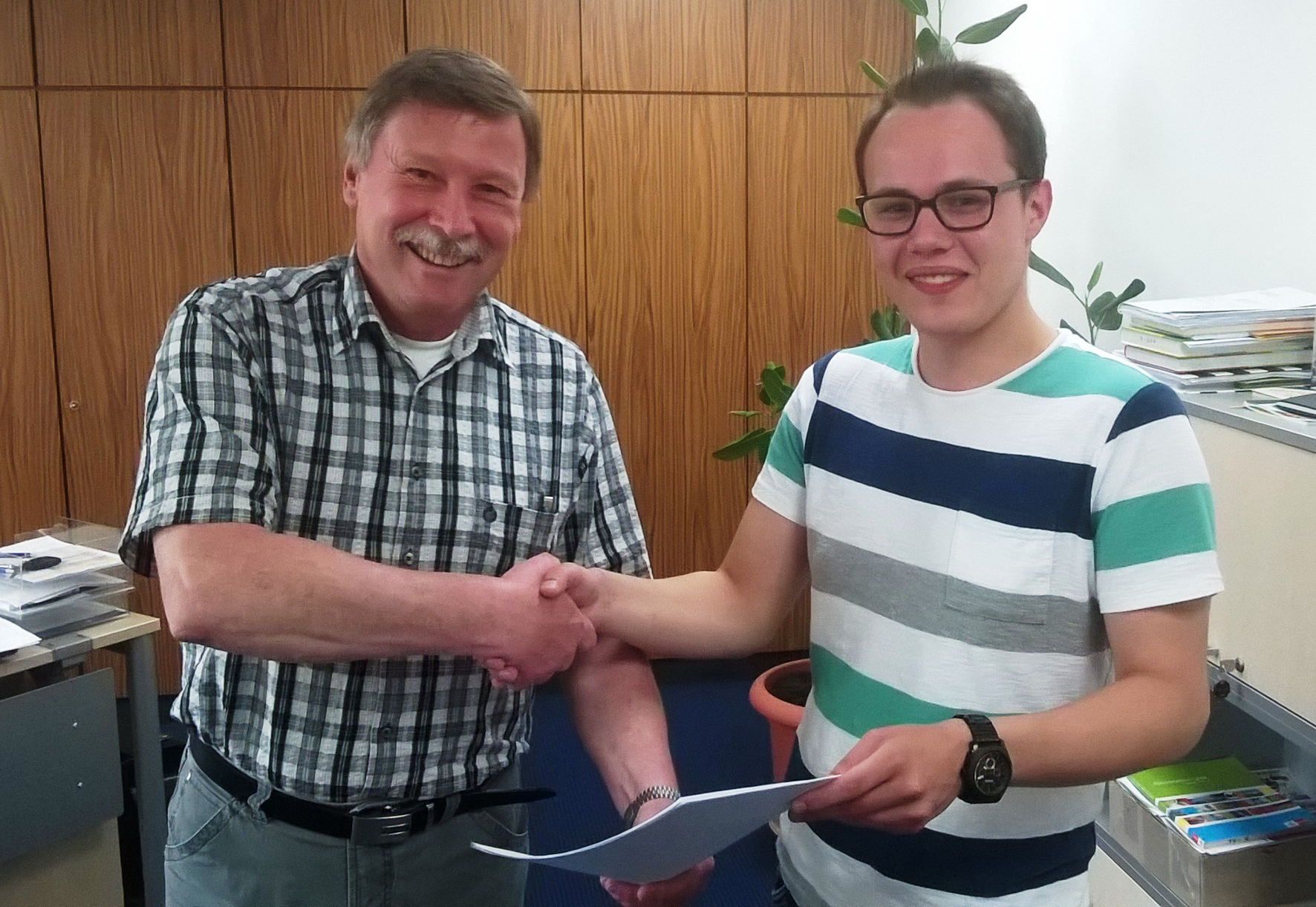 Schulleiter Karl-Heinz Loch beglückwünscht Christoph Walther zum erfolgreichen Abschluss des Abiturs am Weiterbildungskolleg Linker Niederrhein. Er hatte im Modell "Abi-Online" in den letzten drei Jahren den Abschluss auf dem zweiten Bildungsweg nachgeholt. Foto: Kreis Viersen / Abdruck honorarfrei