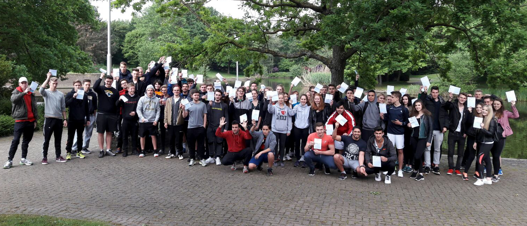 Stolz präsentieren die Schüler des Bildungsgangs "Freizeitsportler" ihre Urkunden. Sie haben sich gemeinsam an einem Sponsorenlauf im Rahmen der bundesweiten Aktion "wir laufen für UNICEF" beteiligt. Foto: Kreis Viersen / Abdruck honorarfrei