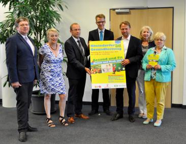 Prof. Dr. Peter Schwimmbeck, Direktor Kardiologie Klinikum Leverkusen, Dr. Maria Radi, Vorsitzende Rheindorfer Pänz e.V., Markus Märtens, Beigeordneter für Bürger, Umwelt und Soziales, Prof. Dr. Stefan Reuter, Direktor Allgemeine Innere Medizin Klinikum Leverkusen, Oberbürgermeister und Schirmherr Uwe Richrath, Dorothea Skerhut, Fachbereich Soziales, und Helga Vogt, Fachbereichsleiterin Soziales. (v.l.n.r.)